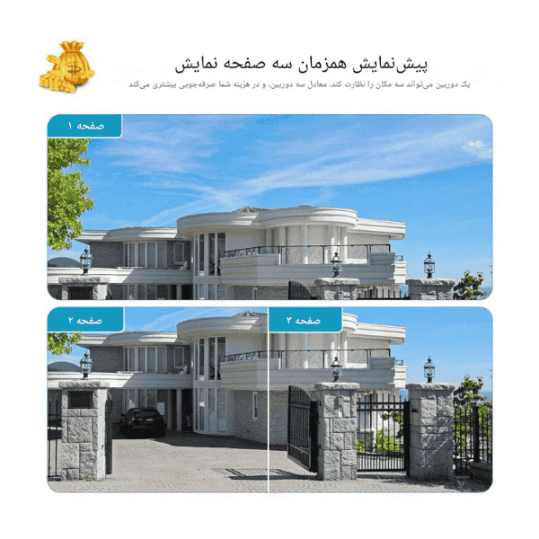 لنز دوم با زاویه دید گسترده، مناسب برای پوشش محیطهای باز مانند حیاط، انبار، پارکینگ یا باغ است. کاربر میتواند بین لنزها جابهجا شود یا هر دو زاویه را بهصورت همزمان مشاهده کند.